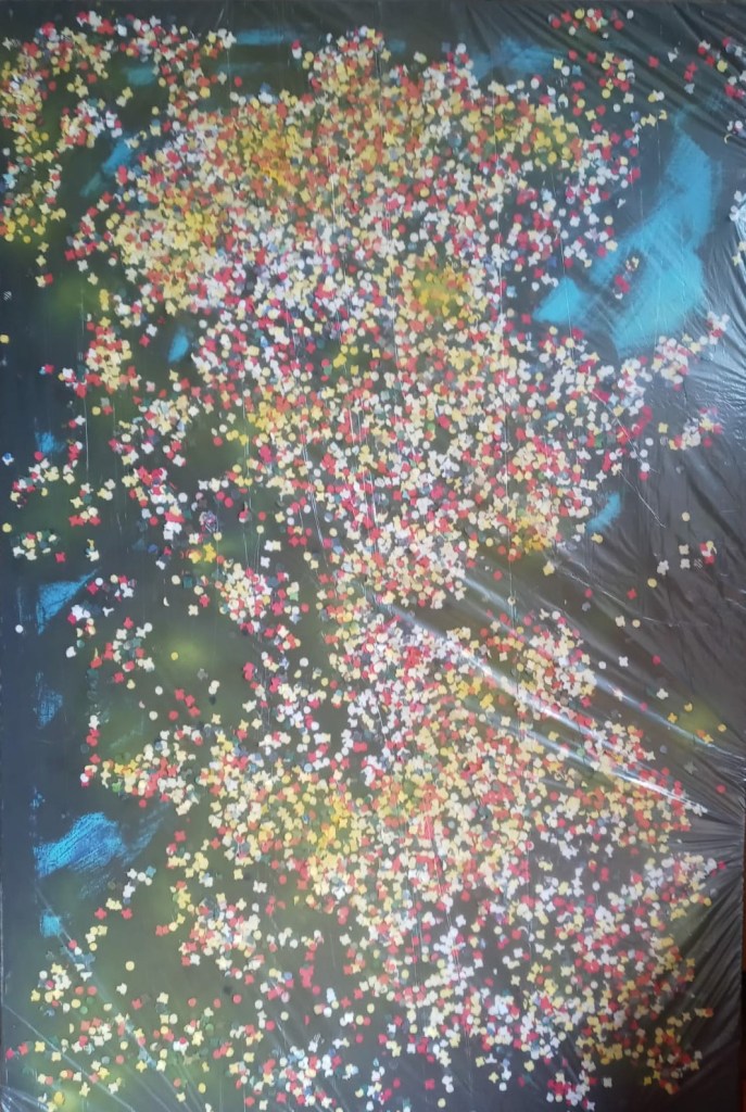 Confetti-skyscape called “Coriandolo”, dated 1984 (after Festa’s participation at the Venice Biennale), dimension 120 x 80 cm, mixed technique on canvas.